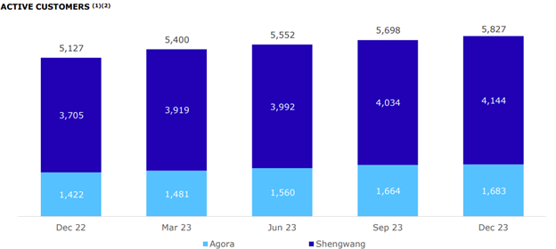 Agora was famously known for helping power Clubhouse, the social network that benefited from COVID hype at the beginning of the pandemic. After the fading of Clubhouse as well as K12 tutoring bans in China, the business has struggled with dollar-based net retention rate slowing drastically in ’23 but has been consistently adding new customers QoQ.