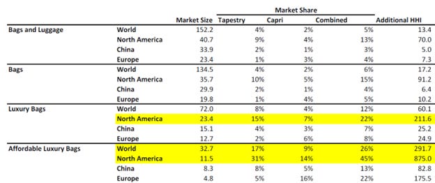 This high market share also results in a high diversion ratio and with high gross margins and a high General Upward Pricing Pressure Index (GUPPI) test. By my estimates, Tapestry (31%) and Capri (14%) would combine to have a 45% share. (We note some accessories are included in the bags definition as the companies do not have a complete break down of bags. Excluding the entirety of the accessories segment would still result in significant share for TPR, CPRI, and CombineCo).