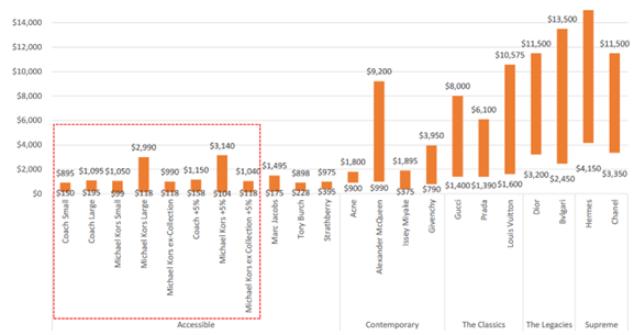 This tiering in price is significant and defensible as clearly seen in Figure 1, TPR and CPR both do not have brands that are sold within the same tiers as high end luxury brands and any price increases will largely effect competition within the affordable segment, and specifically between Kors and Coach which are the largest handbag brands in the category in North America.